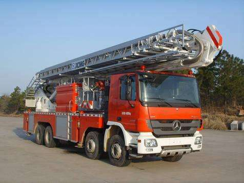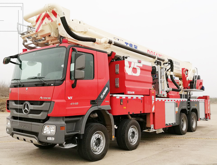 DG54C3 Aerial Platform Fire Truck is mounted on a Benz Actross4160 chassis. Monitors and fire pump used are imported from USA. An automatic B-class foam proportion mixing system is fitted. It has a tank that can hold 2.5 t of water and 0.5 t of foam and is equipped with a m.nitor on its top. Permissible lifting capacity of boom head ear is 2 t, for platform ear it is 0.4 t.
