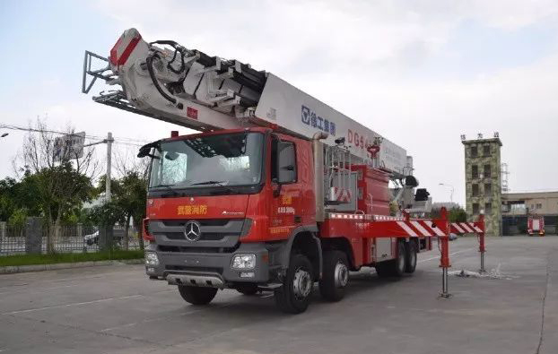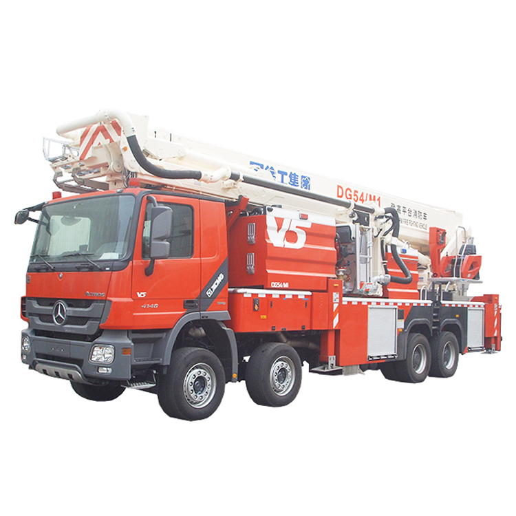 DG54C3 Aerial Platform Fire Truck is mounted on a Benz Actross4160 chassis. Monitors and fire pump used are imported from USA. An automatic B-class foam proportion mixing system is fitted. It has a tank that can hold 2.5 t of water and 0.5 t of foam and is equipped with a m.nitor on its top. Permissible lifting capacity of boom head ear is 2 t, for platform ear it is 0.4 t.