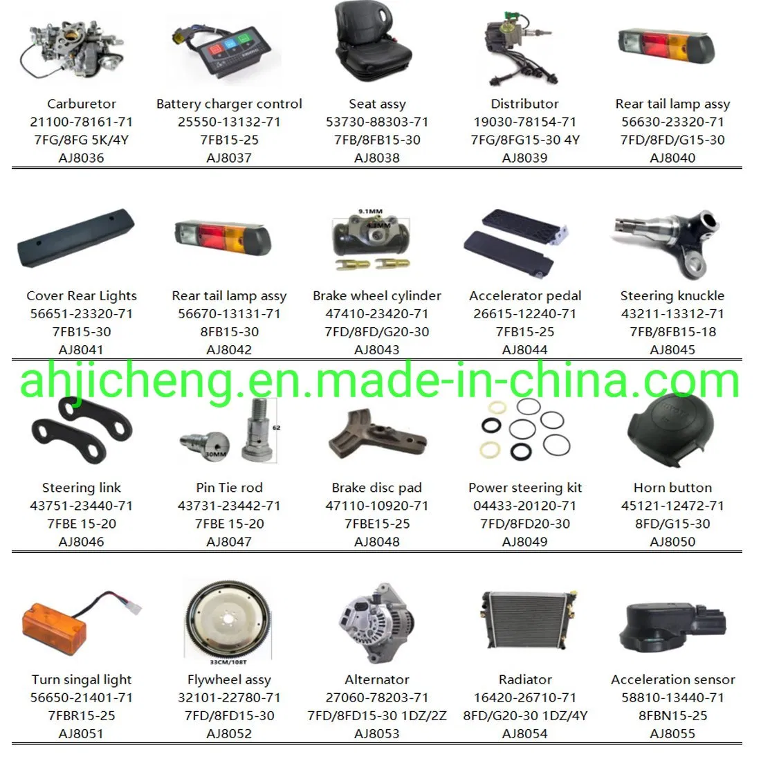 | Spare parts range | 14194-10922-71 Drive motor sensor assy 56630-23320-71 Rear tail lamp 45190-13900-71 Steering sensor cable box 24280-13130-71 Electric current sensor assy 58860-10920-71 Rotary sensor assy 54720-22061-71 Switch key 23100-78154-71 Fuel pump for 4Y 56550-13130-71 48v Head light 56510-11900-71 Front head light 53750-13900-71 Seat pad assy 57510-13300-71 Accelerator sensor 58830-23320-71 Switch assy 67830-16561-71 Potentiometer 89452-76001-71 Direction sensor 47210-23321-71 Brake master cylinder 47403-12810-71 Brake shoe 47401-33240-71 Brake shoe 33103-13900-71 Spiral Bevel 47470-13900-71 Brake wheel cylinder 45714-13900-71 Counter shaft 56640-13131-71 Rear tail lamp 47410-10480-71 Brake wheel cylinder 58840-26600-71 Pressure sensor 43211-23321-71 Steering knuckle(R) 46102-13131-71 Parking brake leaver 51937-13130-71 Louver RH or LH 52516-13130-71 Cover RH or LH 53233-23320-71 Leaver Boots 53441-13130-71 Foot pads 57462-10920-71 Switch assy direction 04655-20093-1 Repair kit 52210-N3070-71 Gas spring 13506-78150-71 Hydrailic chain 21100-78161-71 Carburetor 25550-13132-71 Battery charger control 53730-88303-71 Seat assy 19030-78154-71 Distributor 56630-23320-71 Rear tail lamp assy 56651-23320-71 Cover Rear Lights 56670-13131-71 Rear tail lamp assy 47410-23420-71 Brake wheel cylinder 26615-12240-71 Accelerator pedal 43211-13312-71 Steering knuckle 43751-23440-71 Steering link 43731-23442-71 Pin Tie rod 47110-10920-71 Brake disc pad 04433-20120-71 Power steering kit 45121-12472-71 Horn button 56650-21401-71 Turn singal light 32101-22780-71 Flywheel assy 27060-78203-71 Alternator 16420-26710-71 Radiator 58810-13440-71 Acceleration sensor 17743-23600-71 Air filter 13519-78202-71 Gear 23302-23440-71 Priming pump 23390-76001-71 Fuel filter 67502-23000-71 Hydrailic filter 26620-26622-71 Accelerator cable 32560-23330-71 Charging pump 32610-23330-71 Solenoid valve 14512-22501-71 Steering motor brush 04654-30340-71 Cylinder seal kit 67120-26650-71 Hydraulic pump 82152-25080-71 Side shifter 43811-10481-71 Hub wheel axle 52515-13130-71 Side cover 52250-13130-71 Gas spring 67502-26600-71 Hydraulic oil filter 57440-23320-71 Light switch assy 90109-14002-71 Hub boot 16100-78203-71 Water pump 16100-78205-71 Water pump 16110-78703-71 Water pump 52209-10920-71 Hinges 52208-13130-71 Hinges 42411-26600-71 Front brake wheel hub 24470-13300-71 Contactor repair kit 16511-23641-71 Water hose 82151-25150-71 Slider shifter 43231-26600-71 King pin 04433-10090-71 Rear axle repair kit 54154-23320-71 Roof cap 56540-13130-71 Head light 15601-76009-71 Oil filter 37210-26600-71 Drive shaft suit 53431-10921-71 Foot mat 24750-13700-71 Steering contactor 14180-13900-71 Speed sensor 04671-10910-71 Gear pump repair kit 46401-10920-71 Brake cable 67130-23360-71 Hydraulic pump 04433-10110-71 Steering O/H repair kit 61236-23601-71 Mast bearing 47404-36601-71 Parking brake cable 47405-36601-71 Parking brake cable 47118-26600-71 Pedal spring 47210-23600-71 Brake master cylinder 33410-13500-71 Speed sensor 17741-23600-71 Air filter 16100-78300-71 Water pump 61251-33660-71 Mast bearing 14520-33130-71 Steering motor 51903-23130-71 Hood sub-assy 23302-23040-71 Cap fuel filter 52511-13131-71 Side cover RH 171660 Key pad 17700-30510-71 Air filter assy 51951-13130-71 Hinge sub-assy 37210-23600-71 Transmission drive shaft 56501-23330-71 Head lamp bracket 04433-20080-71 Power steering repair kit 43812-23320-71 Rear wheel stud 16430-23430-71 Radiator 33121-13900-71 Transmisison gear 16420-23431-71 Radiator 33117-23900-71 Bush 04652-20064-71 Cylinder O/H repair kit 04652-10350-71 Cylinder O/H repair kit 52511-13130-71 Cover fender mudguard RH 45510-30513-71 Hydraulic pump 67501-32880-71 Hydrailic filter 45510-30563-71 Steering gear assy 43811-23320-71 Hub rear axle 47410-20540-71 Brake wheel cylinder 43811-20540-71 Hub rear axle 51947-23130-71 Side cover LH 51947-13130-71 Cover fender 90114-12012-71 Hub bolt 12361-26600-71 Engine mount 33311-13130-71 Trans driver shaft 16420-N3250-71 Radiator 67502-20540-71 Hydraulic oil filter 04655-20121-71 Cylinder O/H repair kit 16410-23430-71 Radiator 33321-33130-71 Gear box 45520-33240-71 Steering gear assy 16410-23420-71 Radiator 53710-13900-71 Seat back assy 58810-13900-71 Speed sensor 04433-30110-71 Power steering cyl rp kit 26620-23640-71 Accelerator cable 1921-64220 Brake wheel cylinder 4300-33000 Rear axle hub 14103-84220 Spring gas S-1850-0037 Power steering motor 24300-38120\54000-89322 F/R switch 38920-00550 Direction sensor 32010-05220 Brake mast cylinder 36410-07570 Rear lamp assy 32911-03360 EPS steering screw 35810-63421 Contactor S-1850-0059 Power steering motor 70001-33650 Key switch 14300-62961 center arm 24300-44230 accelerator 14104-27992 Pedal 50007-70660 Lamp rear cover 37410-00990 Steering motor 8271-70050 Contactor 14105-10122 Back rest assy 14104-28023 Foot mat 31850-58370 Tilt cylinder RH 31220-12300 Speed sensor 1901-55101 Needle bearing 14300-59961 King pin 1901-55102 Thrust bearing 31230-02520 Tir rod 31230-02390 Tie rod 32090-01480 Rear mirror 14104-46552 Battery cover 32051-23730 Brake shoe 50001-16582 Ventilation hood 50007-70630 Rear lamp cover 50007-70650 Rear lamp cover 70000-02070 Hydraulic filter 36410-07390 Single lamp assy 14300-59921 Central arm 1908-86001 Hydraulic filter 31850-53130 Tile cyl 33111-02740 Brake pad 54000-81400 Boot circuit board 70000-56760 Mould 14104-12933 step 14104-28002 step 50007-70640 Rear lamp cover 54000-97761 Boot circuit board 70001-24160 Friction plate 31850-53140 Tile cyl | ||