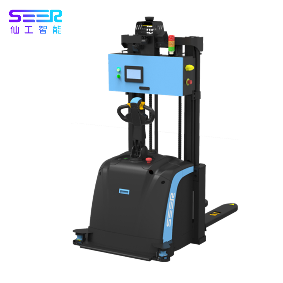 SRC-powered Laser SLAM Small Stacker Automatic Forklift , is equipped with a built-in SRC Series Controller developed by SEER. It can deploy easily without reflectors by adopting Laser SLAM navigation, pick up accurately by pallet identification sensor, deploy easily without reflectors by adopting Laser SLAM navigation, work through narrow aisle with slim body and small gyration radius and ensure 3D safety protection by various sensors such as 3D obstacle avoidance laser and safety bumper. This product is the preferred transfer robotic for goods moving, stacking and palletizing in the factory.