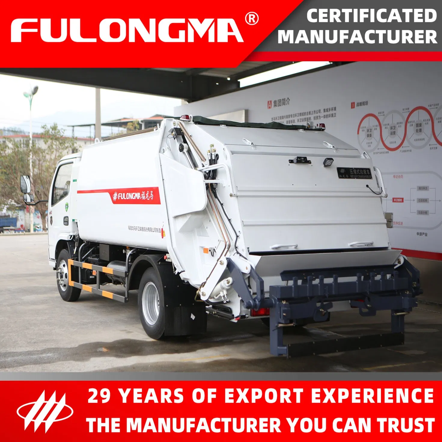 This truck is a special vehicle for garbage collection and transfer developed by FULONGMA with the introduction of international advanced technology. It has the clear advantages of large garbage loading, no secondary pollution, reliability and durability.